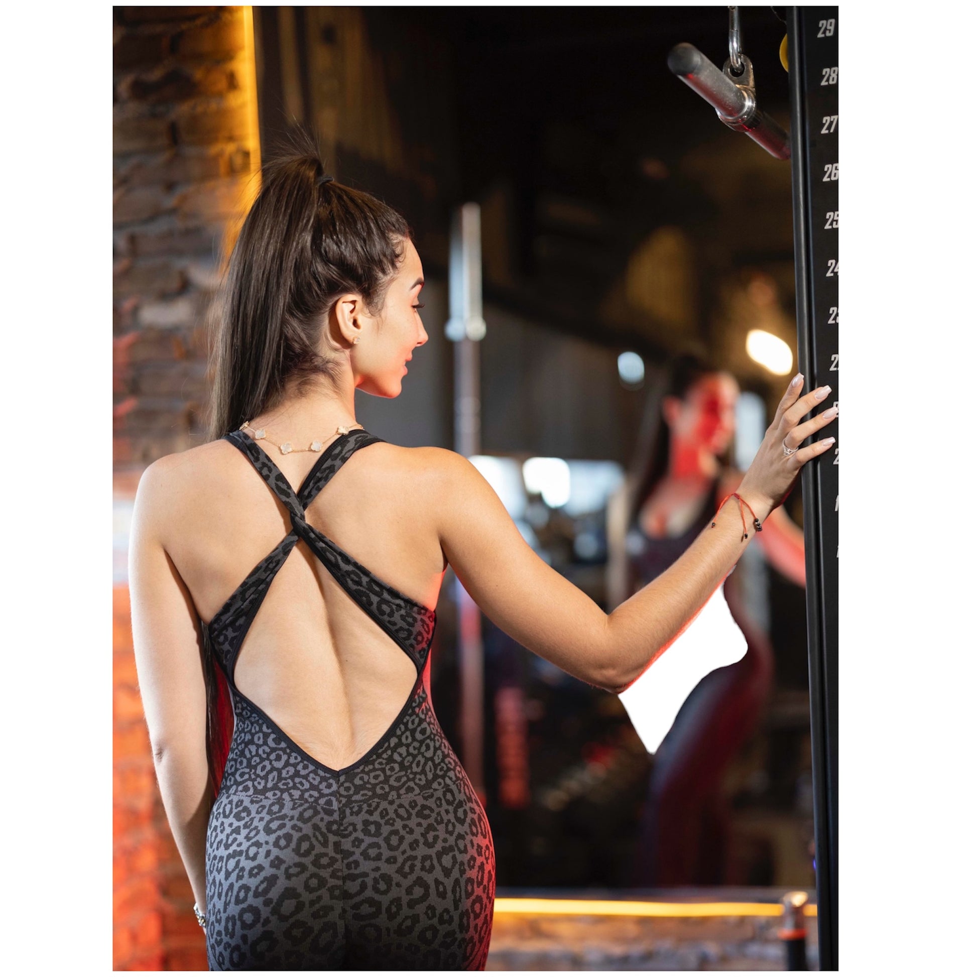 Conjunto Sanday Activewear negro con estampado animal print. Su diseño ajustado y de pierna acampanada realza tu figura mientras te brinda comodidad y elasticidad en cada movimiento. Perfecto para destacar dentro y fuera del gimnasio.