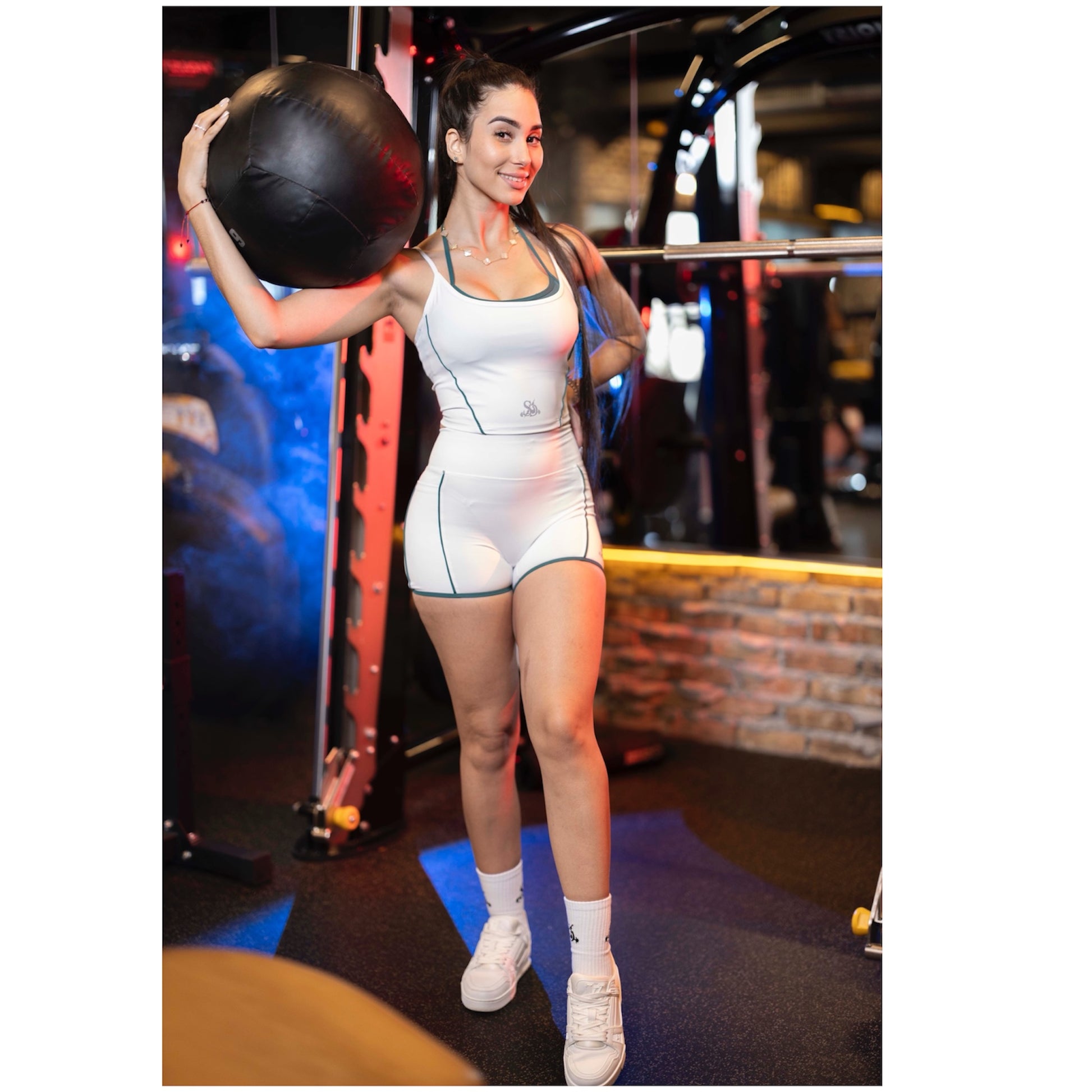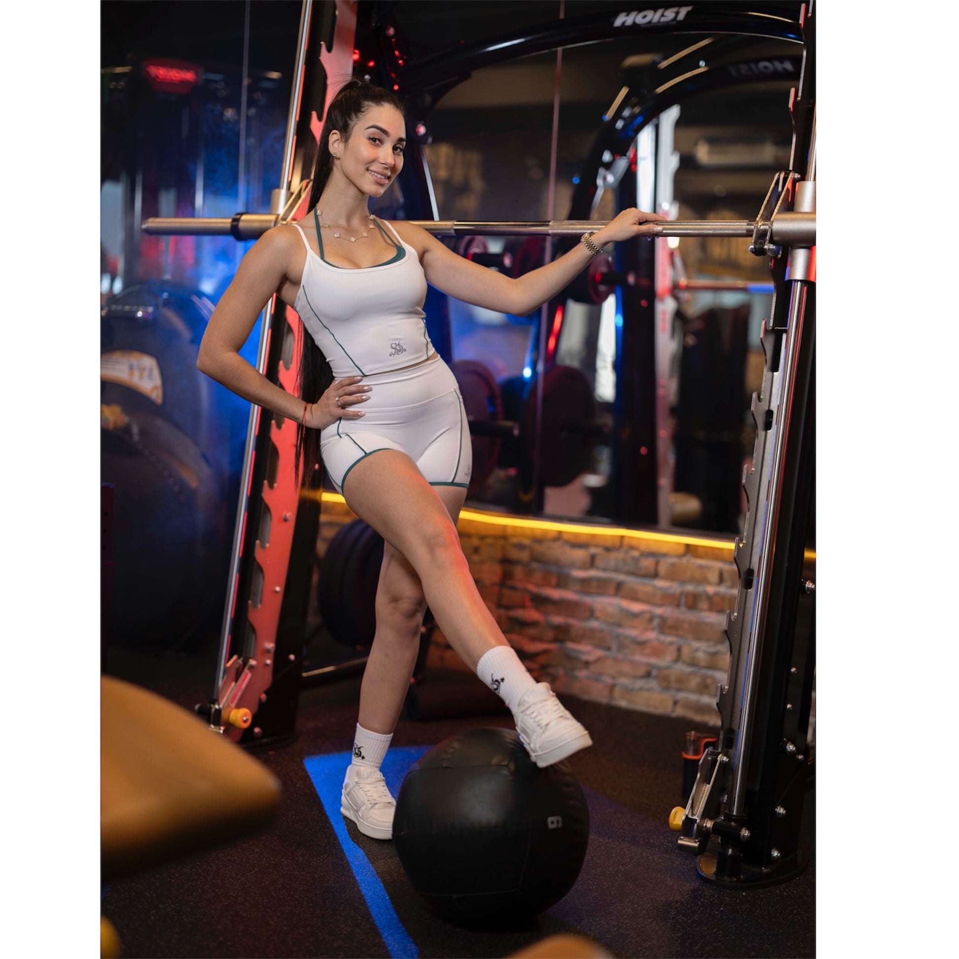Conjunto deportivo de dos piezas para mujer, compuesto por una blusa ajustada de tirantes y un short de tiro alto.