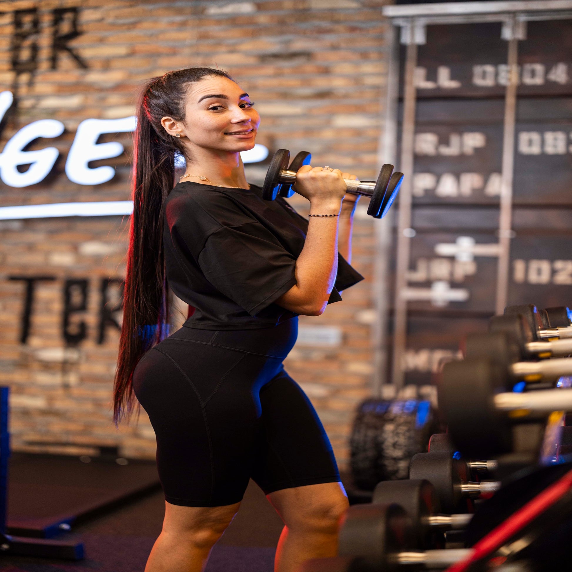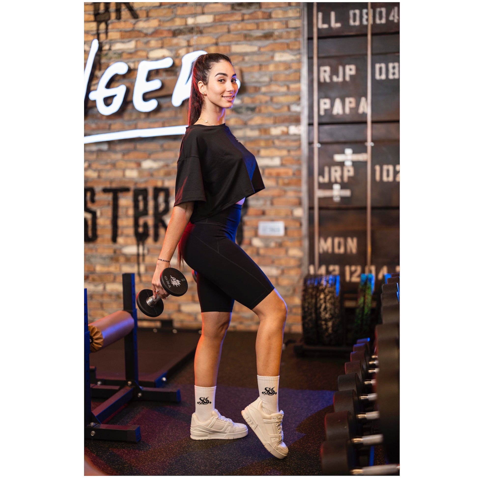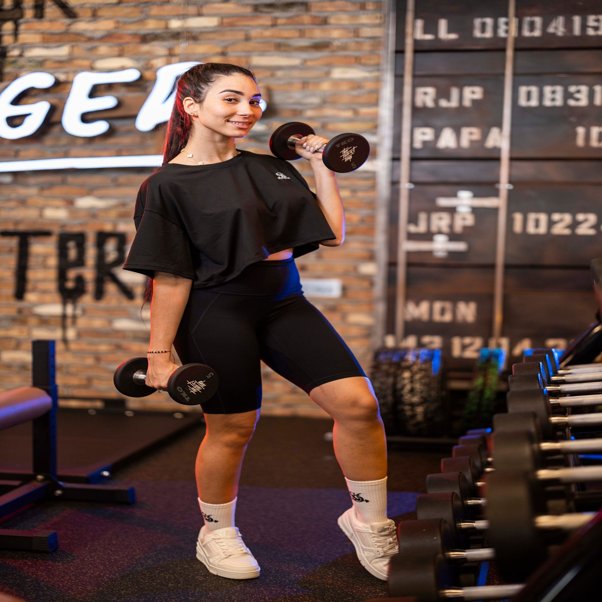 El producto es un conjunto deportivo de dos piezas para mujer, compuesto por una camiseta oversize de manga corta y unos bikers ajustados de tiro alto.