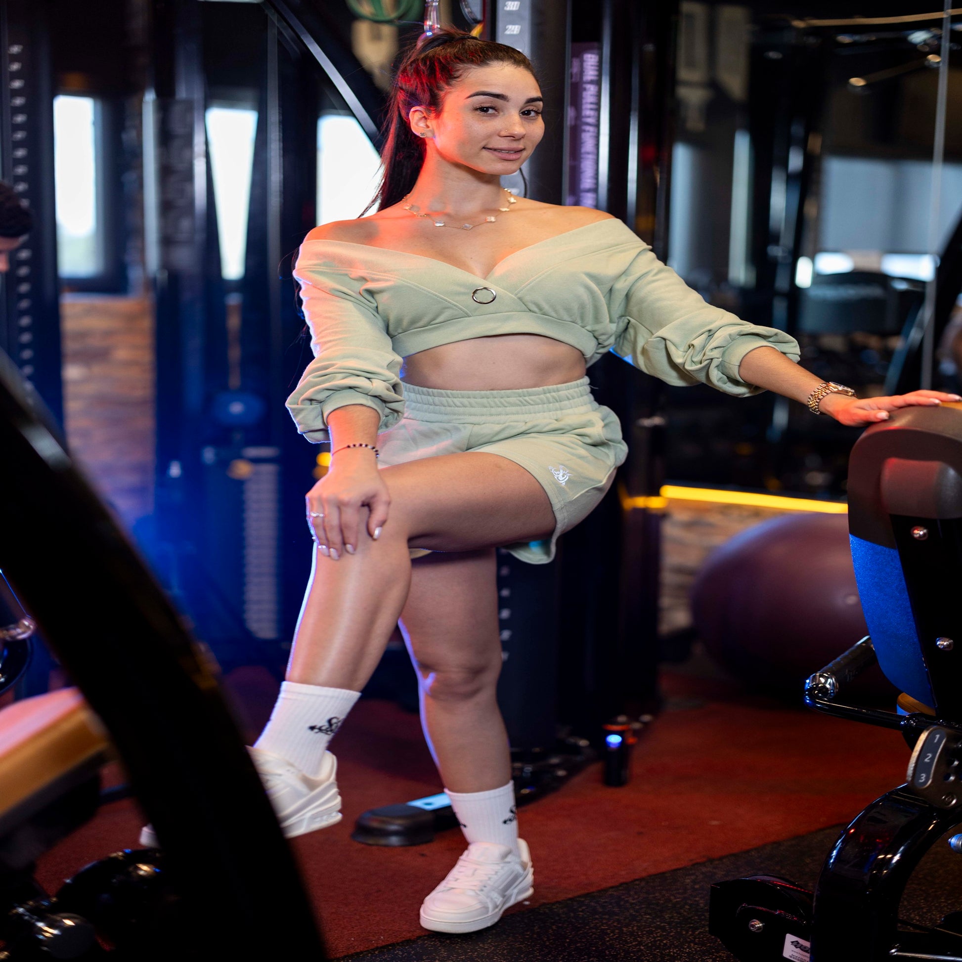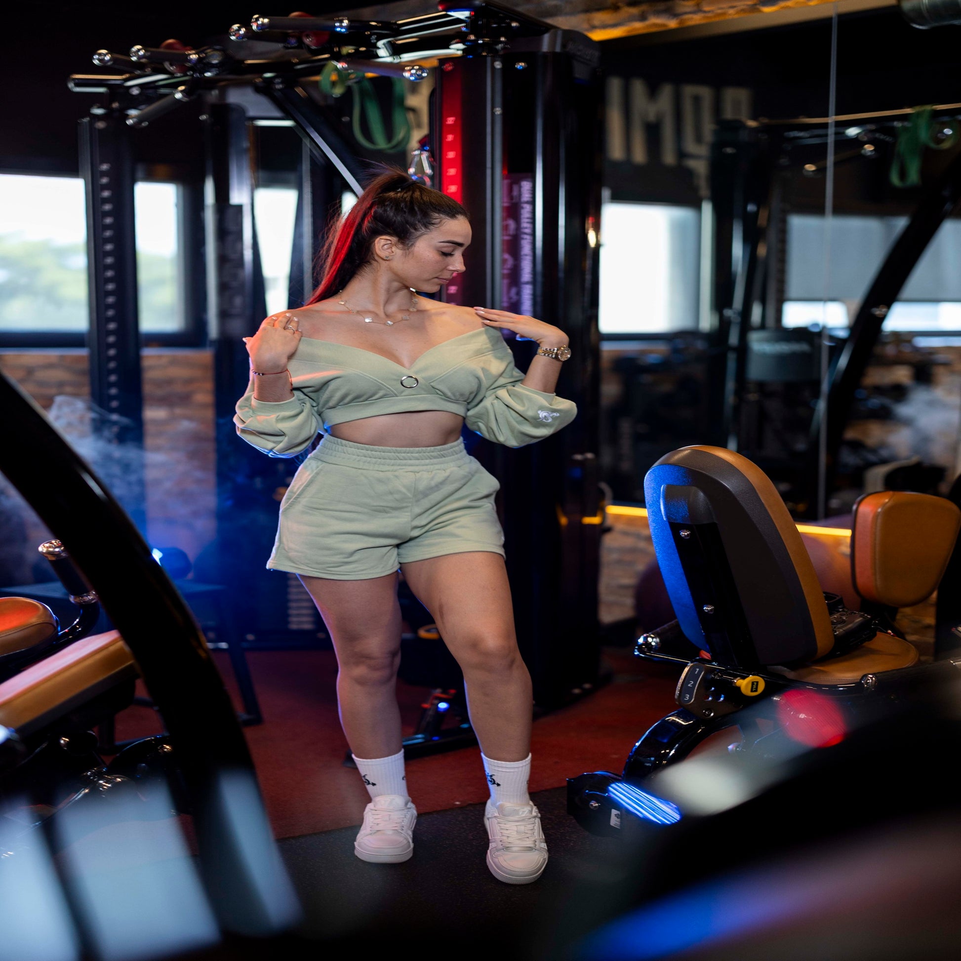 El producto es un conjunto casual de dos piezas para mujer, formado por un crop top de manga larga con hombros descubiertos y unos shorts holgados de cintura alta.