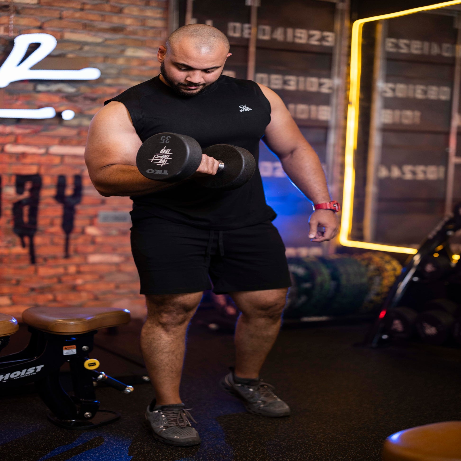 Conjunto deportivo para hombre compuesto por camiseta sin mangas y short en tela ligera y elástica. Ofrece comodidad, libertad de movimiento y transpirabilidad, ideal para entrenamientos de fuerza o rutinas en el gimnasio.